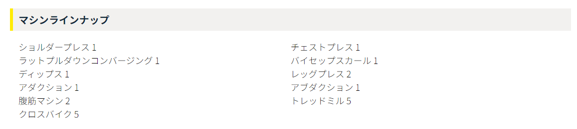 | マシン | ショルダープレス2 チェストプレス1 ラットプルダウン2 レッグプレス2 アダクション1 アブダクション1 アブベンチ1 トレッドミル6 バイク2 バイセップスカール1 ディップス2 |